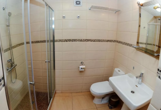 - Standard cottage (25 sq. m) is designed to accommodate from 2 to 4 people. The room is divided into a bedroom and a guest hall with a sofa bed. The bathroom has a shower.