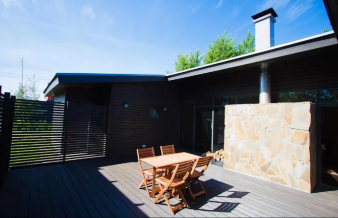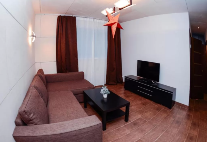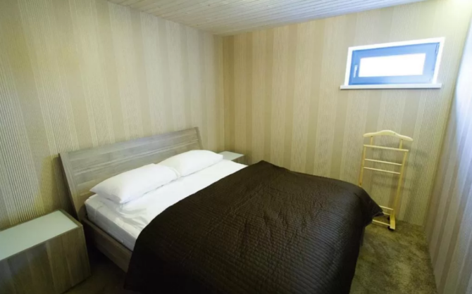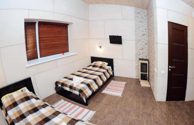 - Double house (16 sq. m) is made in the Scandinavian style of natural materials. In addition to electric heating, a stove-stove is additionally installed in the room. There is a kettle. There are rustic floorboards on the floor.