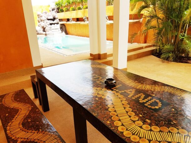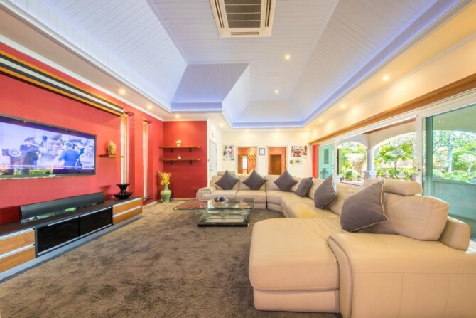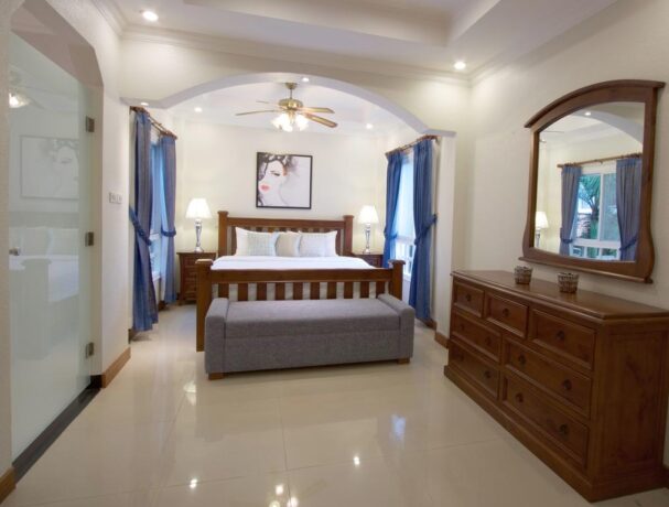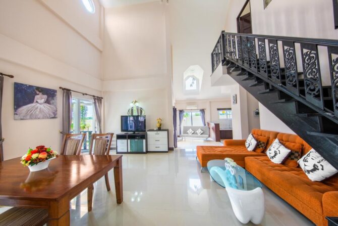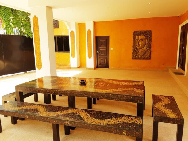 It’s a great place to relax away from the hustle and bustle of the city. At the same time it takes only 5 minutes by car to reach the large and well-maintained beach. Nearby is the shopping and entertainment center and the attraction of Pattaya – the market on the water. Guests can use the villa’s car rental service or book a driver.