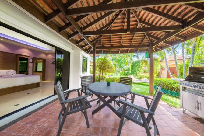 Each villa has a private terrace overlooking the garden and swimming pool. Inside the house is a cozy living room, kitchen, and bathroom. There’s high speed internet and air conditioning. The kitchen is equipped with a stove, refrigerator and microwave. Some villas have their own private pool, but there is also a communal, large area on site.