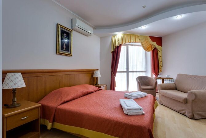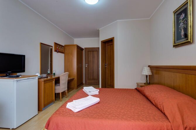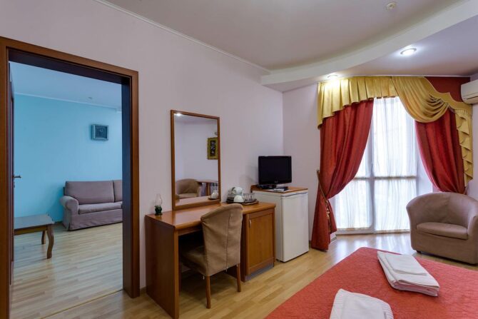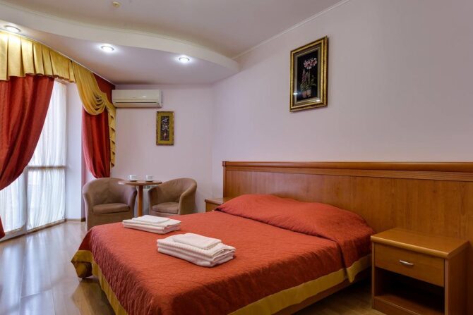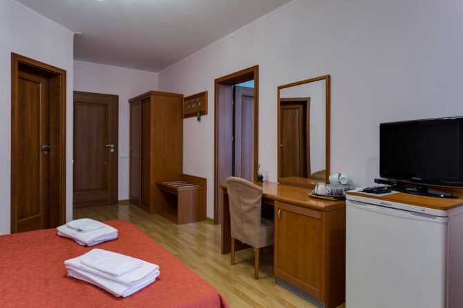 Each room has at your disposal: Italian furniture, modern refrigerator, TV, air conditioning, shower room or bathroom with toilet, there is even a balcony. The building also includes a luxury restaurant and a sauna located in a controlled area. It offers free parking, a clean, comfortable swimming pool, a playground for children.