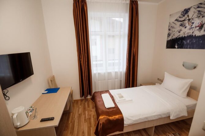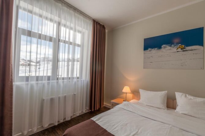 In the buildings of the hotel there are a total of 345 rooms of different levels. Each window offers stunning views of the Caucasus Mountains. The rooms have a small refrigerator, tea utensils, an electric kettle and a modern coffee maker. So if you want to ski in the early morning, then you do not have to wait for the opening of the restaurant, you can drink morning tea without leaving the room.