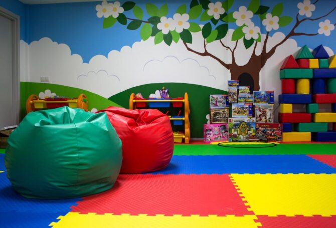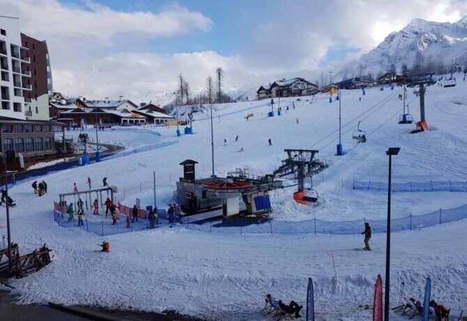 The children’s area is located at the mountain station of the feeder lift (Olympia gondola) right next to the large base house on the Rosa Plateau. There is also a children’s club “Egorka”, which can be visited by children aged three years (maximum four hours), a children’s recreation area, a ski school for children and a ski kindergarten for very young athletes.
