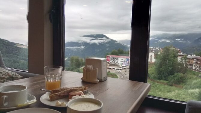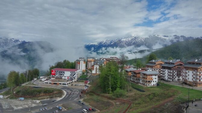 Rosa Khutor, Sochi’s most popular ski resort, boasts the longest cable car to its highest peak, Rose Peak. To get there, you will have to use several lifts on closed cable cars. For those who are afraid of heights, it may be a little scary to move in closed booths, but the views are worth it! Clouds between mountains, snow on the tops, grazing cattle – fantastic! In addition, the lifts are brand new and very safe.