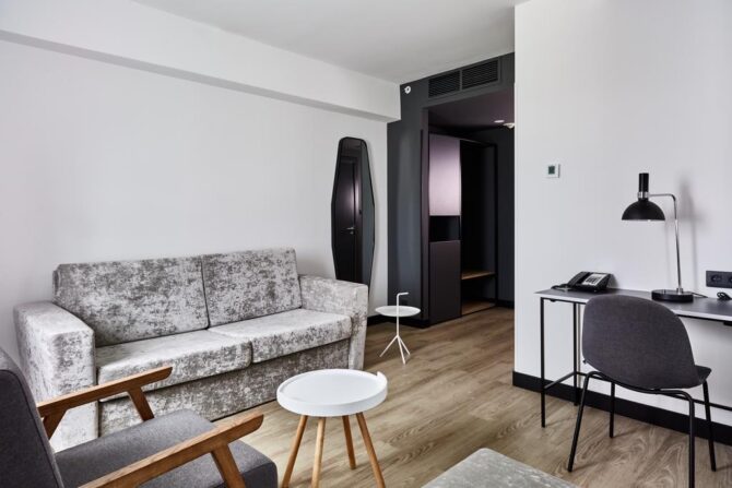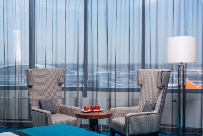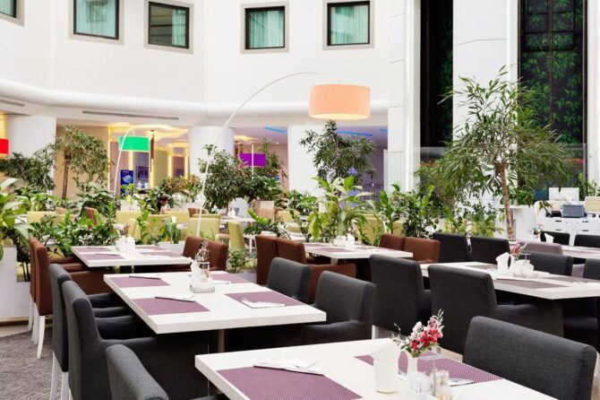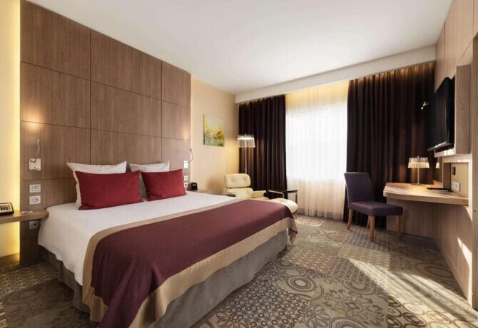 300 meters from the airport is a cozy hotel with standard and superior rooms. There is an executive suite. Children under 16 years old who come with their parents stay free of charge. Transit passengers are accepted with pets (the service may be paid). A free shuttle service is available to Terminals B and D. Breakfast is served buffet style in the Cote Jardin restaurant. Another Fusion restaurant opens at 12 p.m. It specialises in European cuisine and grills. A fitness centre is available for sports. Guests can make use of the sauna, Turkish bath and swimming pool.