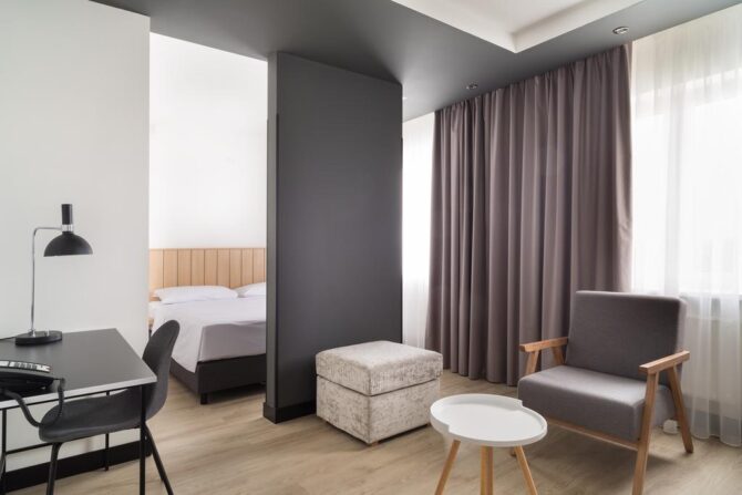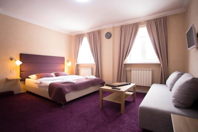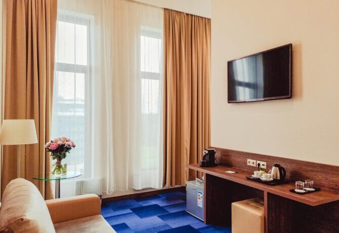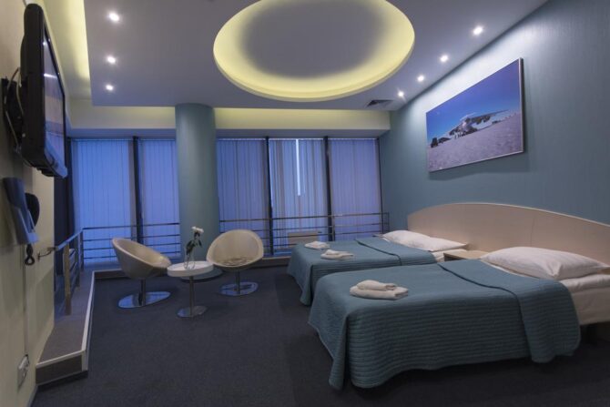 The hotel complex is located in the Khimki Forest, 2 km from Sheremetyevo Airport. In the room stock there are classes: standard, superior, business, economy, luxury, apartments. All rooms are soundproofed. The restaurant serves an early breakfast (from 05.00 am). There is a daily rate from 06.00 to 23.00 without breakfast. A free round-the-clock transfer to all Sheremetyevo terminals is provided. On the 7th floor there is a children’s playroom. There is a gym with sauna and swimming pool.