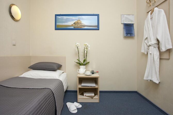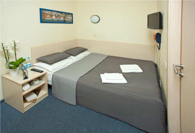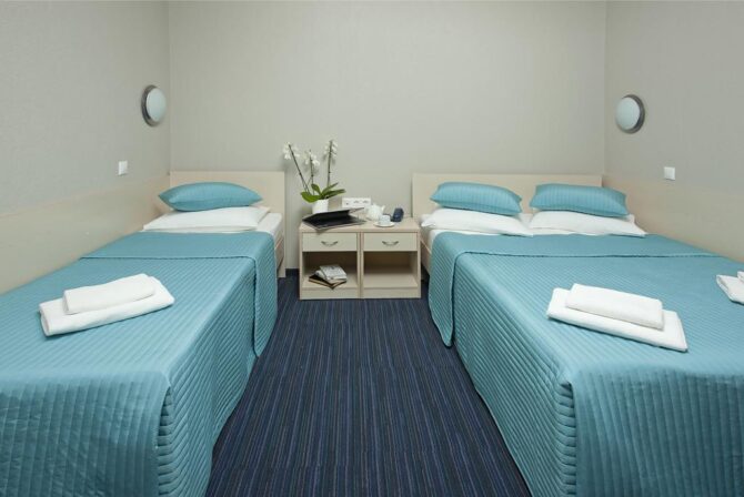The two-star hotel is located on the 5th floor of the Aeroexpress terminal in the general waiting area. From terminal B there is a round-the-clock shuttle, from other terminals you can walk along the signs. A Russian passport or visa will be required for accommodation. In the absence of a visa, the administrator will offer to stay in a partner hotel located in transit terminal E. Payment for accommodation is hourly. Pets weighing up to 3 kg are accepted for an additional fee. 112 roomsare prepared for accommodation. There is nothing superfluous in them – only beds, bedside tables and a bathroom with a shower. Two floors below is a good restaurant VkusVil, grocery stores.