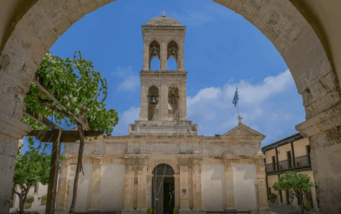 Tourists who are interested in getting acquainted with the religious buildings of Crete should definitely visit the monastery of Gonya, located 22 km west of Agia Apostoli on Rhodopos – a picturesque peninsula. The monastery, towering over the Bay of Chania, is a building similar to a medieval fortress.