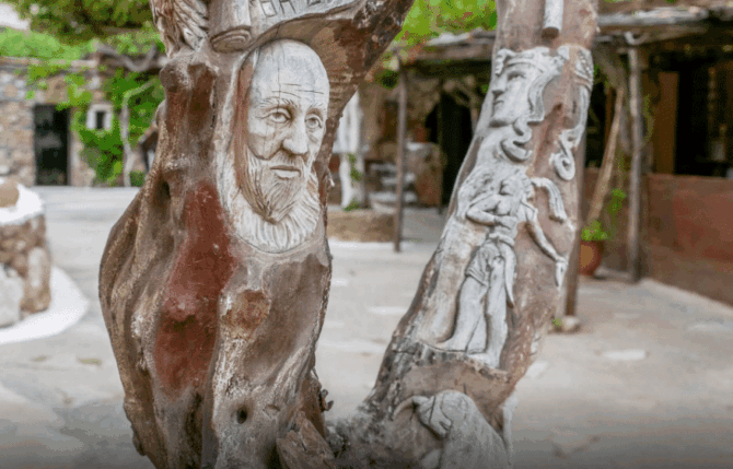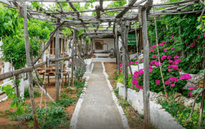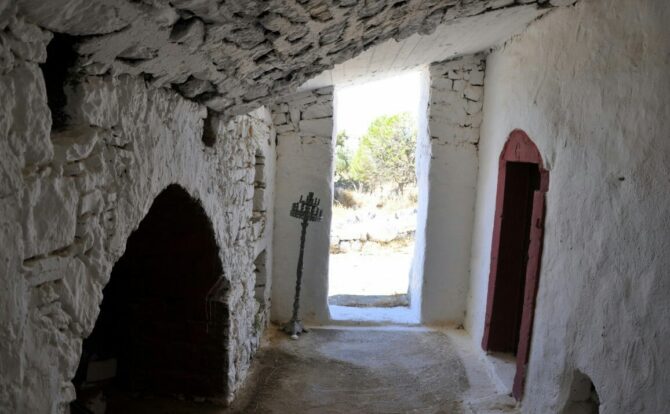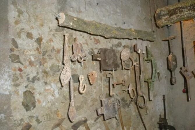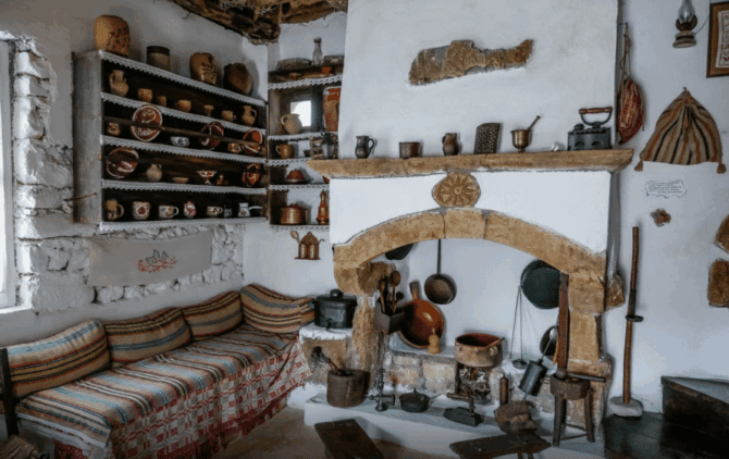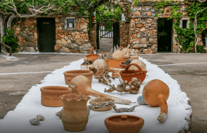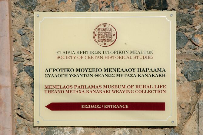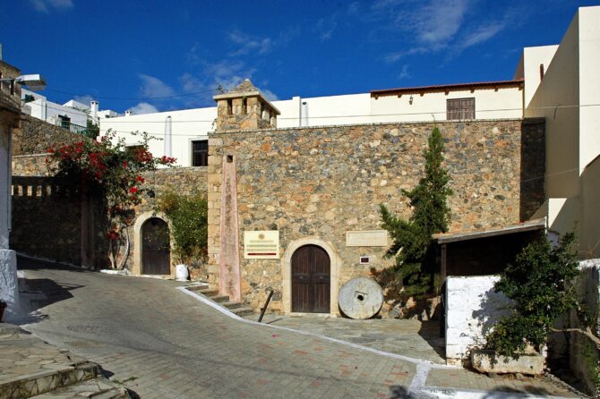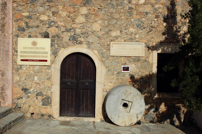 The mountain village of Piskopiano is famous for its agricultural museum. It belongs to the National Historical Museum located in Heraklion. The exposition is located in an old mill where olive oil was produced. The building was provided by the family of Menelaus Parlamas, it once housed their family factory. The collection was assembled throughout Crete. In 1988, the museum opened to visitors. The exposition consists of three parts. The first exhibition hall is decorated in the form of a traditional Cretan winery. Here are exhibited agricultural tools, which were used to process vineyards and harvest crops. One of the exhibits is an old distillation machine for the production of grape vodka raki. The second hall is dedicated to the main village crafts – blacksmiths, potters, carpenters. The exposition is located in the former press shop. The third hall is dedicated to Cretan textiles. Particular attention is paid to the national embroidery, samples of which were collected in all Cretan villages.