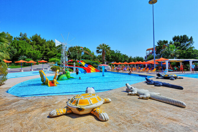 Another water entertainment area is located in Hersonissos. It is smaller and simpler, but also very popular. The water park was opened more than 20 years ago next to the golf course. It is distinguished by special comfort and amenities for relaxation. Attractions are constantly updated. The territory is conditionally divided into active and children’s zones. The water park is called the “Garden of Eden” because of the location of the pools and the lounge on a hill. It offers panoramic views of the surrounding area. The highlight is the garden of exotic plants, a lot of greenery and well-groomed. For thrill seekers there are extreme slides, and swimmers will be pleased with a real Olympic pool.