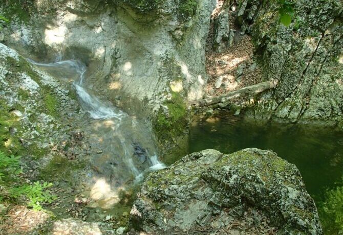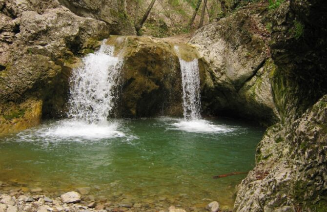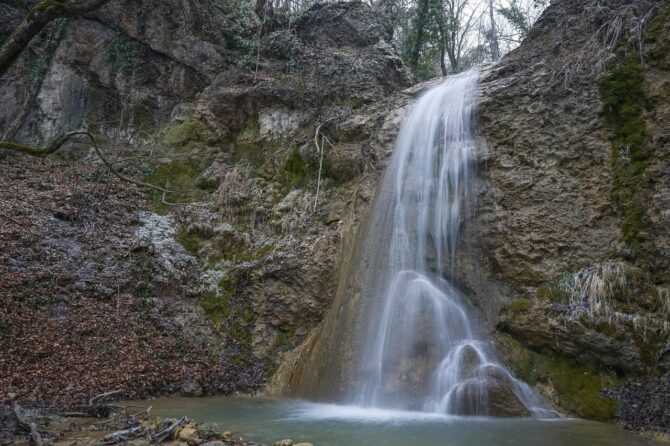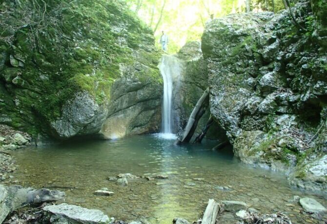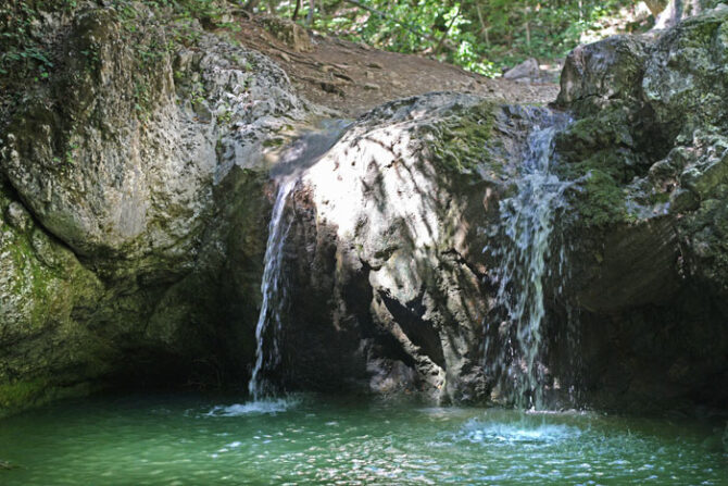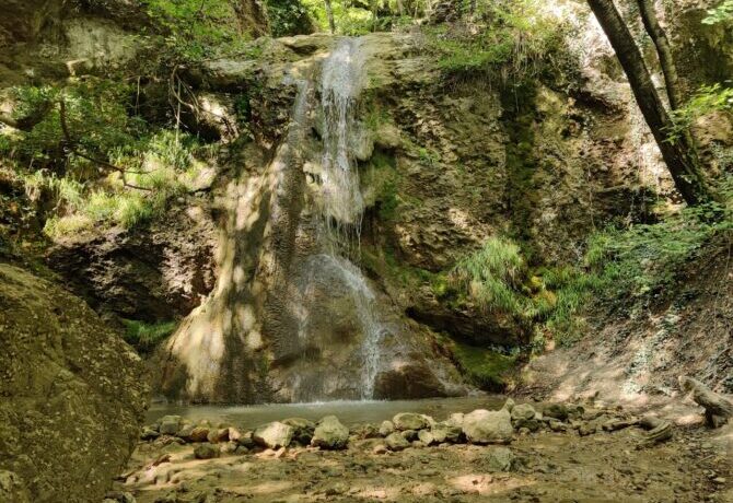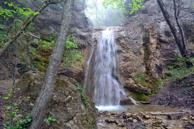However, this place is definitely worth a visit. Uskut, a river 12.7 km long, flows through the peninsula with a winding artery and flows into the Black Sea. On the site between two rocks – Hurguch and Khiz-Kaya – there are seven waterfalls. The height of each of them is from 2 to 10 m.