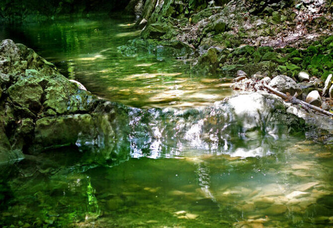 About 19 km south-east of Belogorsk is the “Blue Glade”. So you can translate from the Crimean Tatar name of the gorge Kok-Asan. The beginning of the route through the canyon is located on the southern outskirts of Povorotny – a small village. Through the canyon flows Kuchuk-Karasu – a turbulent river with clear water and numerous rapids.