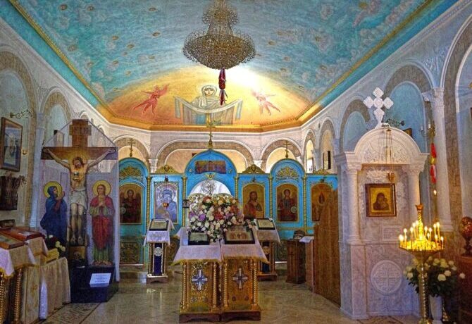 The inner hall of the cathedral is a spacious bright room decorated with high white columns. The solemn atmosphere is created by numerous icons placed on the walls of the temple, brightly burning candles, a painted vault and low-hanging gilded chandeliers.