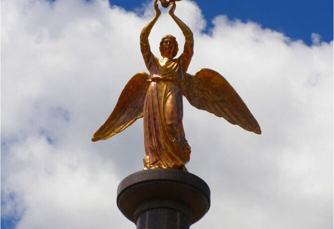 A very symbolic monument with an angel protects Novokuybyshevsk from troubles and unforeseen situations, helps the younger generation to work for the benefit of the country and preserve national traditions. This Angel of Peace is not only here, but also in 23 cities of the country and the world: Moscow, Sochi, Chelyabinsk, Penza, Noginsk, Magadan, Donetsk and others. The sculpture is made differently everywhere, but the Angel for Novokuybyshevsk stands on the globe, he himself is 4.5 m high, cast in bronze and covered with a layer of gold leaf. All this is located on top of the granite column, and the total height of the composition reaches 12 m. It harmonizes well with the architecture of the main entrance to victory Park, conveying the general meaning of preserving national traditions and historical memory.