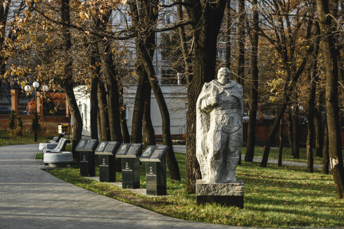 A sculptural composition is also dedicated to the feat of the people: a soldier returns home from the war, and a woman and a child meet him with flowers. And so it happened after the victory, but the equipment that fought to help the soldier is presented in the open area. Residents and guests of the city can see in detail a tank, armored person personron, helicopter, self-propelled guns, a ZIS-6 car with a Katyusha installed on it and anti-tank guns. The entrance to the site with equipment is decorated with a red star, it is easy to find in the park.
