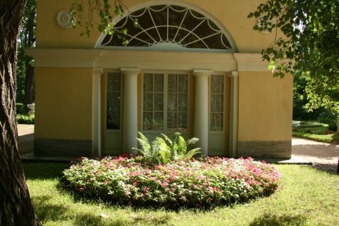 Maria Feodorovna turned the pavilion “Aviary” into a real kingdom of the goddess Flora. In this place there were luxurious flower beds and two greenhouses in which exotic plants were grown. A marble statue of Flora was also brought from Italy and placed in the pavilion “Aviary”. On the site of greenhouses in 1862, verandas were built, between which a pond was dug.