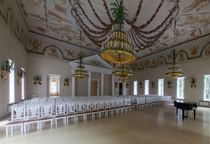 The pink pavilion was surrounded on all sides by roses, which were also the main theme of its interior decoration. In 1814, in honor of the return of Alexander I from Paris after the victory over Napoleon, a ballroom designed by C. Rossi and P. Gonzago was appointed to the Rose Pavilion in 17 days. The double-lit ballroom with an area of about 400 square meters amazes with the splendor of the decoration.
