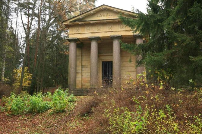 The majestic sandstone building stands on a granite pedestal with wide steps, a four-columned portico holds a tympanum with the inscription: “Spouse to the benefactor”, and on the opposite side – the words: “To Paul I emperor and Autocrat of All-Russia. Born September 20th day, 1754. To the deceased march of the 11th day of 1801.” On the frieze of the mausoleum of Paul I are depicted weeping masks.