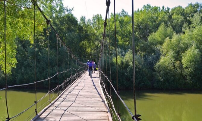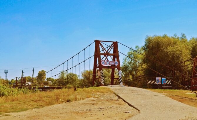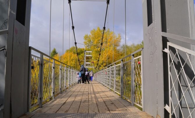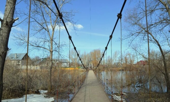 You can finish the tour of the city on the Embankment of the Aley River. The founder of the city Mikhail Rubtsov at one time put the first tent on the right bank, and residents eventually preferred the left bank, and on the site of the foundation are now located suburban areas. Now both parts of the settlement are connected by suspension bridges, which serve as both pedestrian crossings and attractions. A total of 5 bridges were built. It is recommended to start the walk from the southern part of the city, from the houses near the dam of the hydroelectric system. This will be the starting point of the route. There are 2 bridges. Both are designed for vehicles and pedestrians. The traffic is one-way, so one by one you can walk or get to the holiday villages, the second to return back.