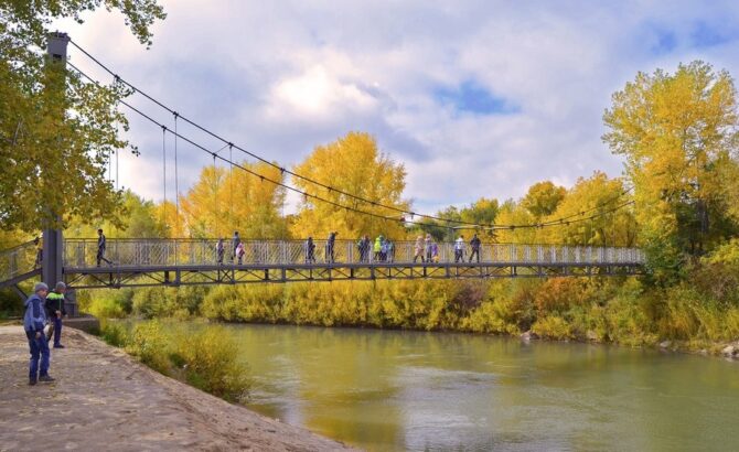 A little further is the main walking bridge of the city. It is laid in the park of culture and recreation. N. Petrov, directly from the Aleya Embankment. The bridge was built in 1977. it’s suspended, but it doesn’t swing like the others. The last renovation with a complete replacement of the wooden deck was carried out in 2018. At the same time, openwork railings were painted, which are additionally used by lovers and newlyweds to hang locks. From the bridge there are excellent, suitable for photo shoots, views of the river and the park.