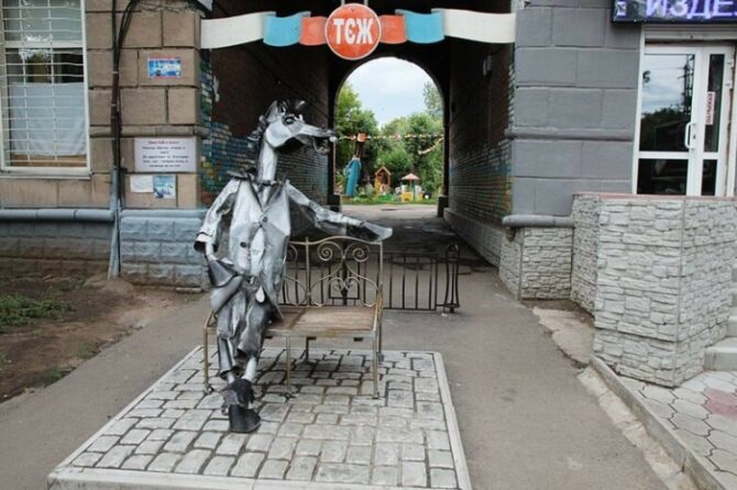 Connoisseurs of art note that all the works of the sculptor are monumental. Even sitting on the bench “Horse in a coat” is thought out to the smallest detail. The height of the figure is 2 meters. A sweetly smiling horse to passers-by, dressed in an elegant coat, from the pocket of which a horseshoe sticks out, for good luck. It is no coincidence that none of the wedding motorcades passes by the monument. The sculptor provided a free space near the figure for those wishing to be photographed with an unusual exhibit. According to the residents of the city, this horse is able to survive all the cataclysms, which means that it is possible to protect itself and its city.