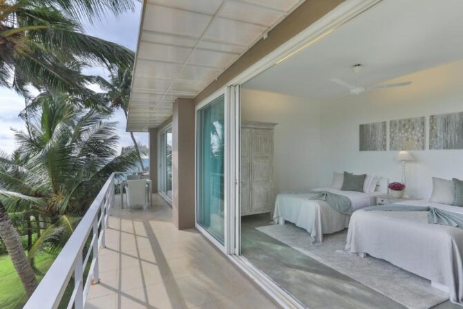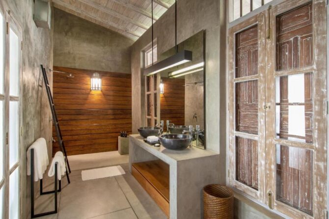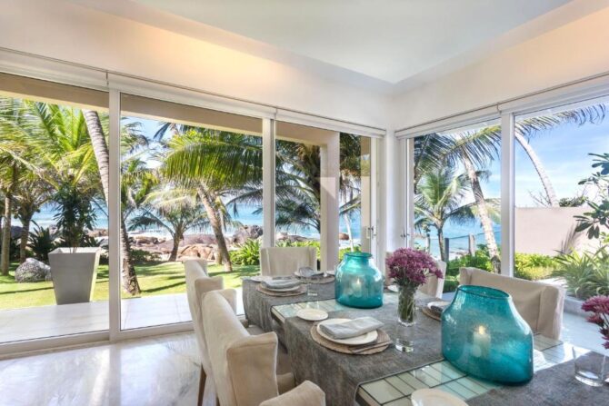 Modern villa built on the beach. First-class accommodation is provided by four luxuriously furnished bedrooms with en-suite bathrooms. They are equipped with every conceivable convenience to make guests’ stay more comfortable and carefree. All four rooms are the same size, approximately 15 x 16 feet, two on the first floor and two located on the second floor. Villa 46 has a rule prohibiting smoking in the rooms and throughout the property, and pets are also prohibited. In the morning, the restaurant serves a continental breakfast. In the afternoon, guests are offered to engage in beach holidays, SPA treatments, fishing and windsurfing. In the courtyard there is a comfortable lounge area with an outdoor all-season pool. In the common living room on the 1st floor there is a library, a film library. Of the household appliances, a washing machine and a dryer are additionally installed. A kitchen is available for meal preparation. The chef of the restaurant is ready to provide his services.