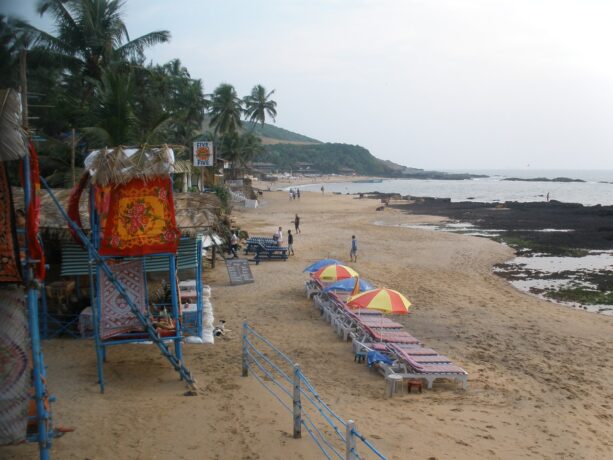 Anjuna Beach is a place for a fun holiday near the ocean. It is usually chosen by European youth to combine bathing and sunbathing with incendiary parties in the open air. The narrow coastline is densely packed with sunbeds and umbrellas. The beach is crowded, and its infrastructure allows you to spend time carefree and enjoy your stay on the coast.