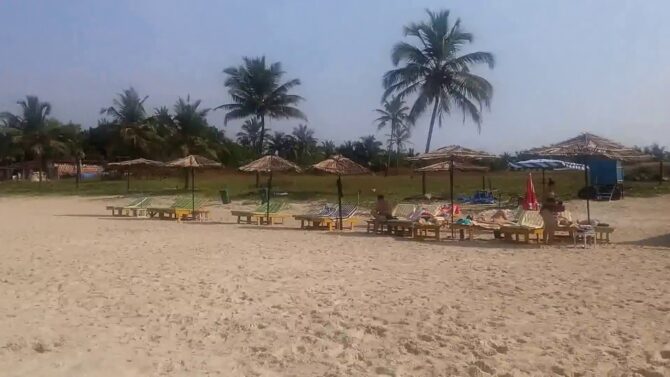 The beach is equipped with several rows of sunbeds and umbrellas. Flat well-groomed area is perfect for children’s recreation. Tides create large “puddles” here, in which babies can safely splash. There is no public transport to the village. Most tourists get here by renting a bike or car in Mapusa or Pananji, the road from which will take about 40-50 minutes.
