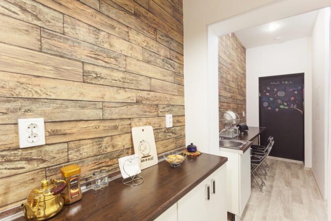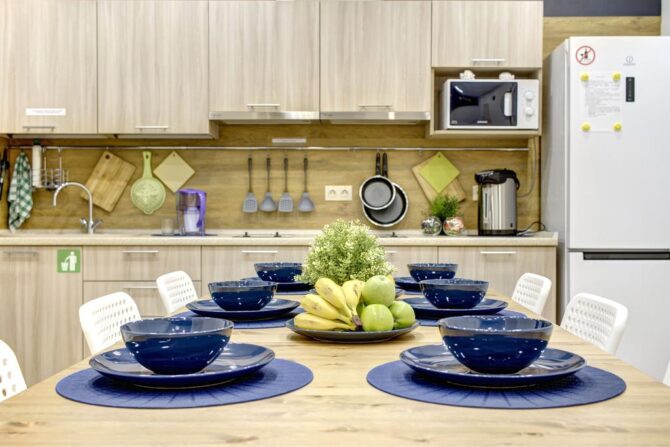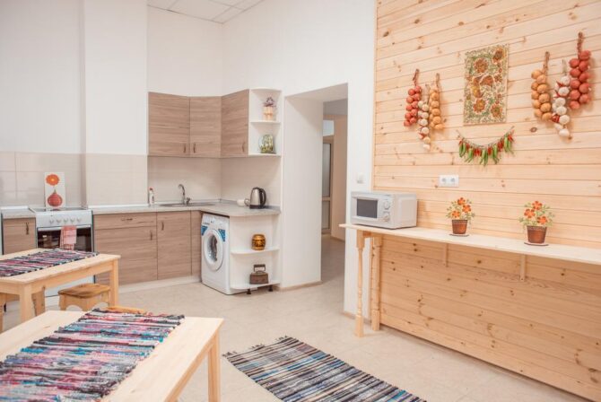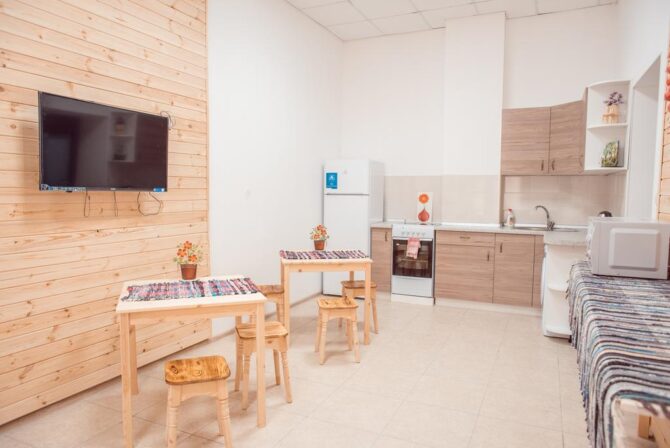 The place is perfect for office workers on a business trip – in any corner of the building there is a high-speed Wi-Fi, which will help to stay in touch even in another area. In the public area there is a kitchen, on which the main equipment and utensils are supplied.