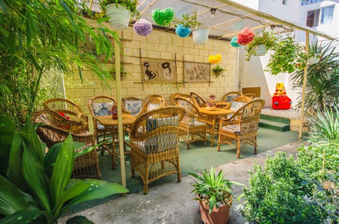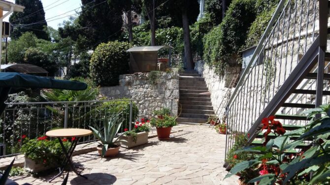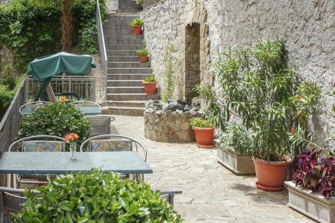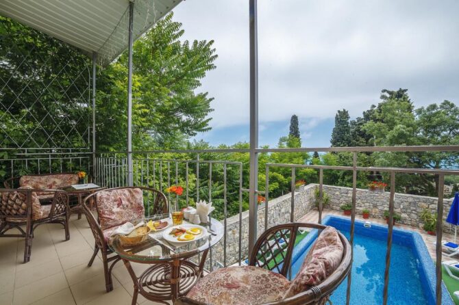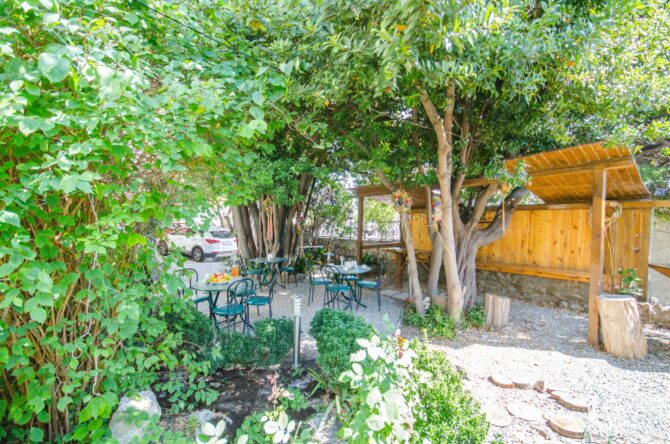 Another option for secluded accommodation within the city offers a private hotel “Oneiro”. The villa is built on the territory of the former possessions of the Greek tea magnate. Guests are welcomed by a nice three-storey mansion, designed for 14 rooms. According to the levels of comfort, they represent Economy, Standard and Comfort. A baby cot will be appointed to the rooms for a fee.