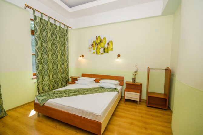 The rating opens a small but very cozy hotel “Migratory Birds”. It is located in a secluded corner on the coast near the Vorontsov Palace. The territory is closed from outsiders and is guarded around the clock. It offers 11 comfortable rooms,located in three elegant wings. Each room is named after one of the gemstones. The color scheme of the design is designed in pastel colors. In the hotel fund there are one-, two-room, duplex rooms. Some rooms have a kitchen. Separate entrances lead to the wings, stone paths are laid between them.