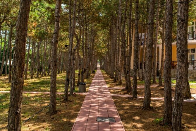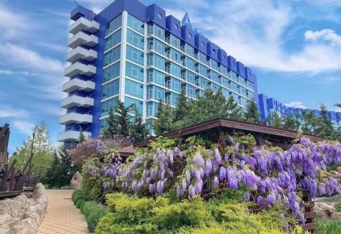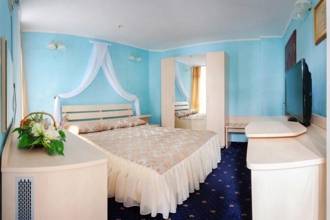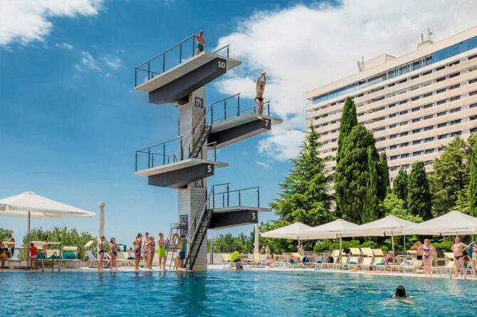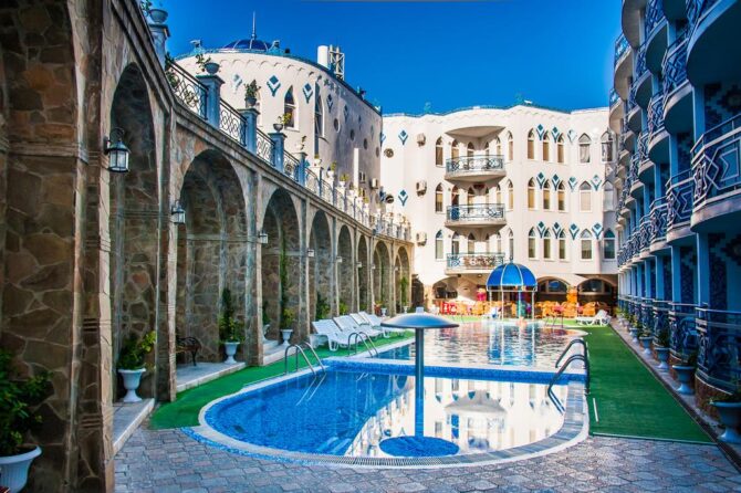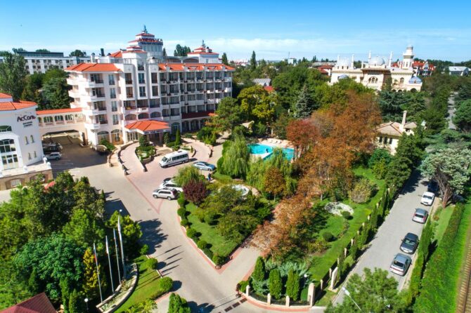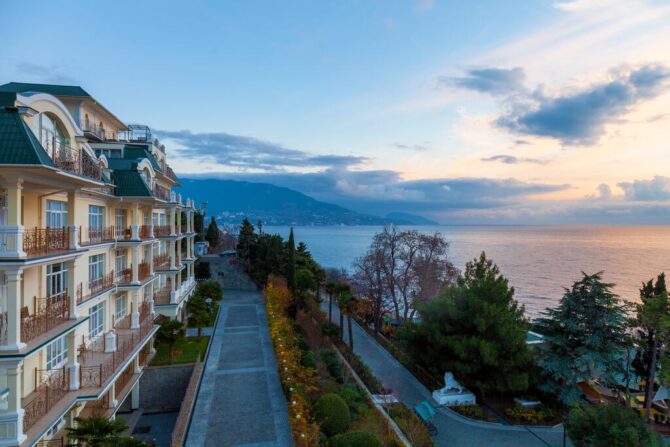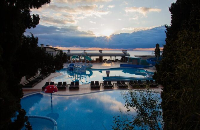 One of the largest Crimean hotels,located right on the sea coast. Similar to the “small state” restaurants, bars, clubs for children, zoo and oceanarium, concert hall, open theater. Around – pools of different depths. There is a fitness center in several halls. On the beach of the complex you can go both on a hard and on a cable car – at the same time to admire the sea. Mud baths, salt cave and Vorontsov baths will help to improve health.