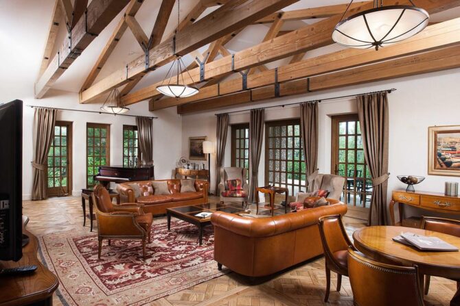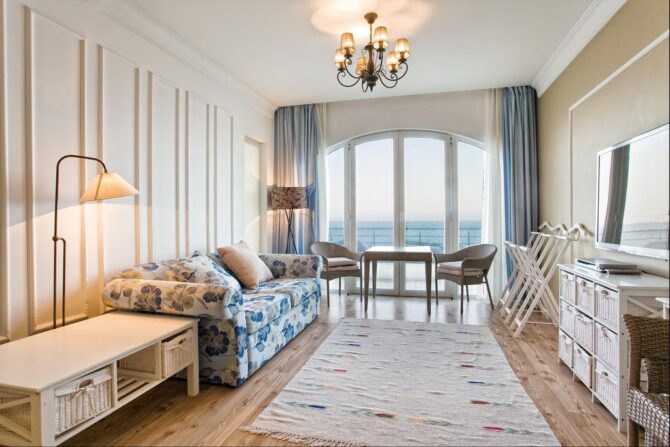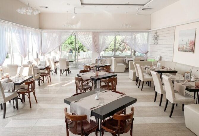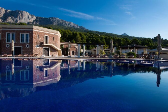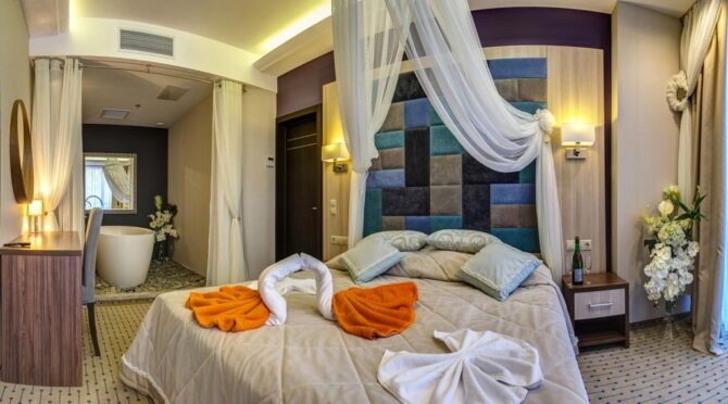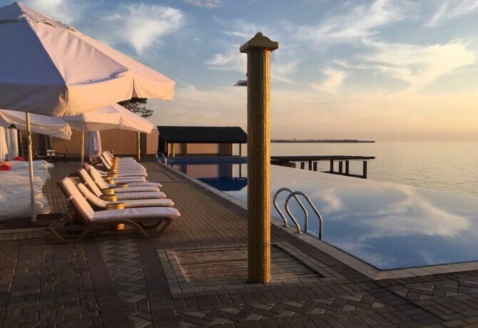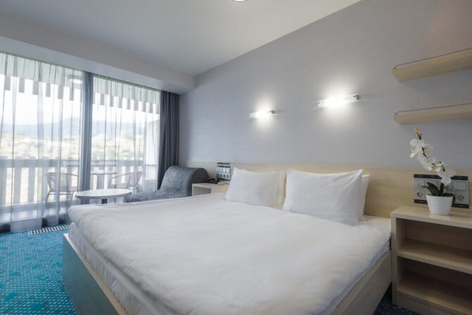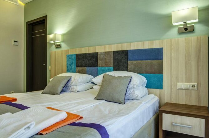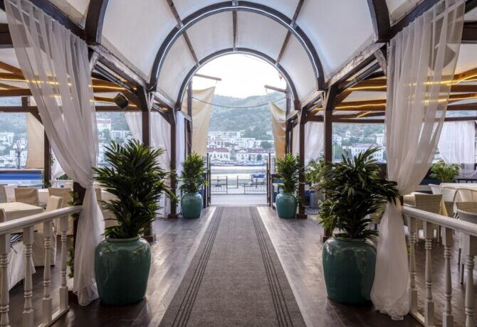The service of the hotel will not let you get bored with your own beach, water park, nightclub, outdoor summer cinema – everything is at the guests’ disposal. The all-inclusive program will offer nourishing meals, wine tasting, ice cream every day. Gyms with exercise equipment will help to maintain shape, the animators of the hotel will find children an interesting activity, and the bath and jacuzzi will relax and soothe at the end of the day.