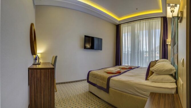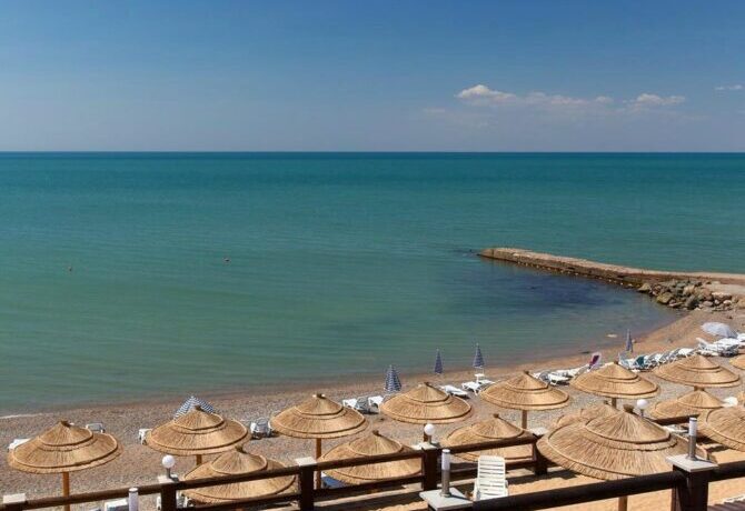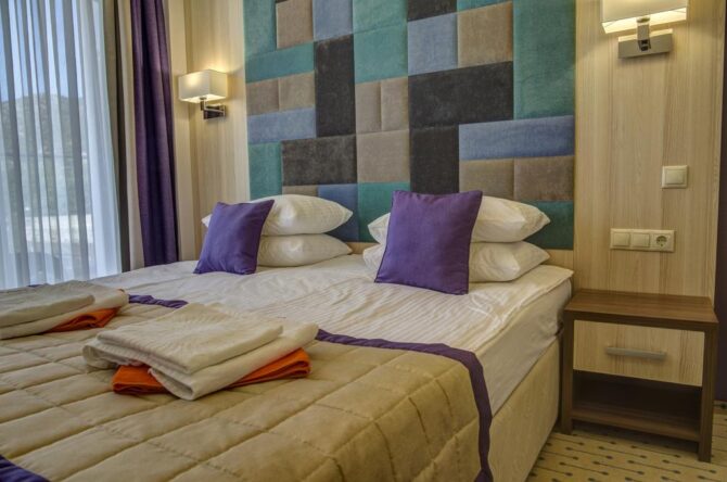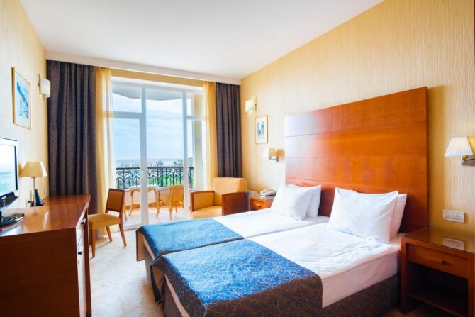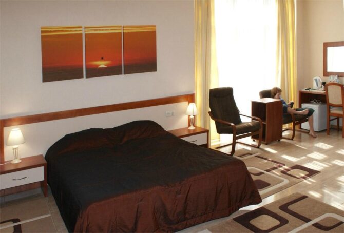 Comfortable hotel with sea view. Facilities for people with disabilities are organized here. The pool has a shallow children’s corner. On the big beach there are many gazebos convenient to walk and relax. For kids up to 3 years old, you do not need to pay for accommodation. The Beauty and Health Center organizes medical procedures, among them – healing oxygen baths, a pleasant soothing massage. Accommodation in the rooms is provided on the principle of “all inclusive”.