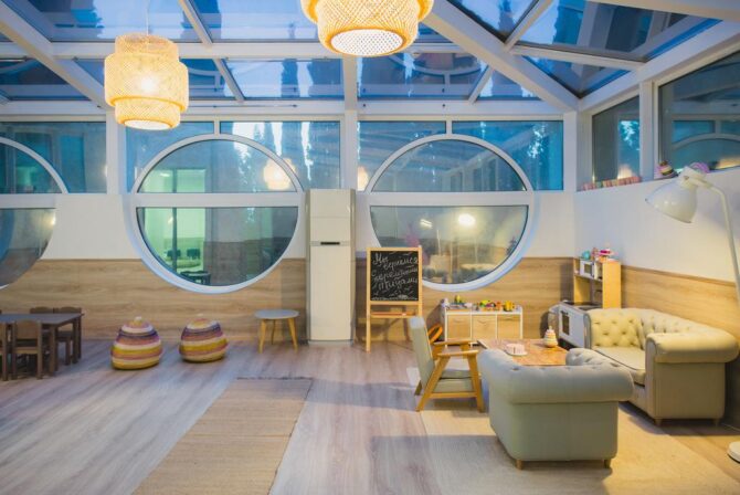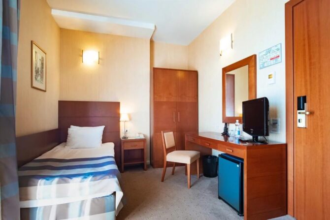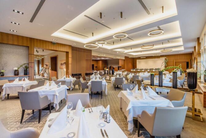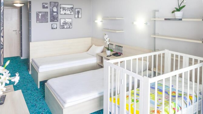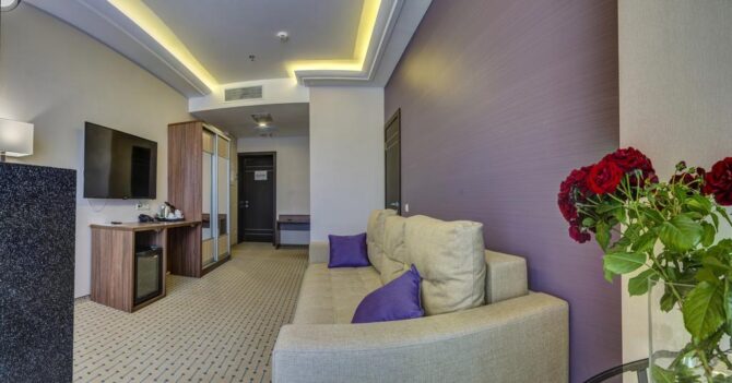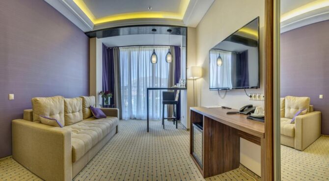 Great hotel for families with children. Trained employees can sit with the child, cheer up the children in the children’s room, young guests organized a special menu in restaurants on site. Near the building there are swimming pools, one of which is indoor. Health promotion can be done in the spa complex, fitness rooms and baths of the hotel.