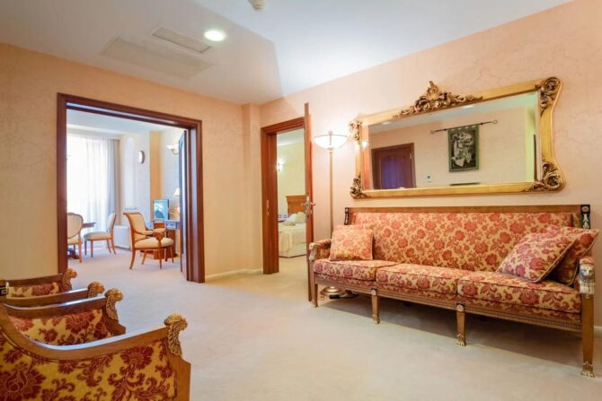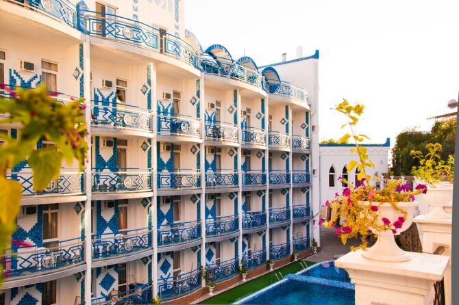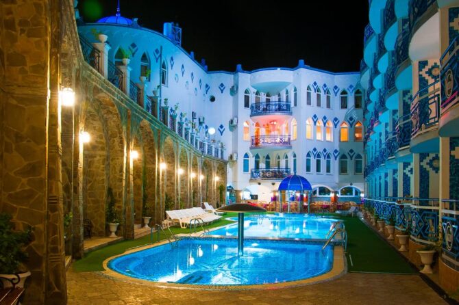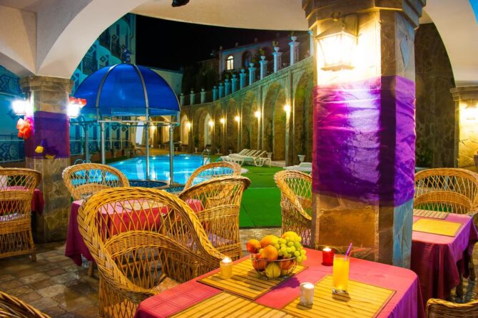 The oriental image of the hotel is embodied in both appearance and service. Spa complexes, baths of several types, massage according to several methods are open to visitors. Body care specialists carry out medical procedures. Parents of young tourists can count on a children’s room and the help of a nanny. The complex is equipped with a swimming pool with a waterfall and geysers with hydromassage function. You can enjoy culinary creativity in the restaurant, bar and wonderful coffee shop.