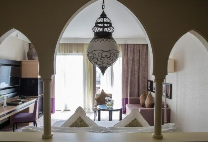 To celebrate the New Year in authentic Arabian interiors and with authentic oriental hospitality invites One&Only Royal Mirage Resort Dubai at Jumeirah Beach. The New Year’s Eve offer includes a gala dinner with entertainment. The direction of leisure depends on the chosen area of residence. The territory is divided into three parts: Palace (Palace), Arabian Court (Arab courtyard) and Residence & Spa (residence in the SPA). Each of them has its own design of rooms,themed restaurants are open. In total, the hotel has 8 restaurants that offer dishes of different cuisines of the world, including Mediterranean, Indonesian, Moroccan. The remaining days of the holidays can be spent on the beach, one of the three swimming pools with a temperature regime, tennis courts, the Water Sports Center. For younger guests, the hotel has daily entertainment by the animators of the Club “KidsOnly”.