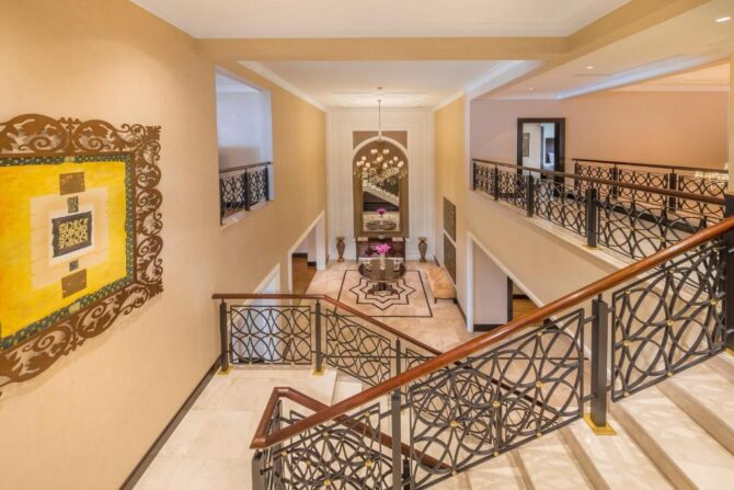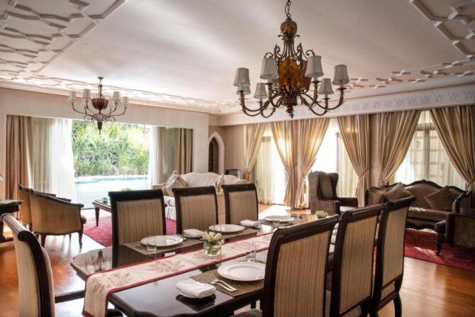 All hotelslocated on the artificial island of Palm Jumeirah are to some extent unique. Jumeirah Zabeel Saray is one of them. Its interiors, courtyards, parks, recreation areas are decorated in the style of palaces of the Ottoman Empire. It offers luxurious rooms decorated with oriental artwork. Some of them are located in the central building. For lovers of secluded recreation there are 38 detached villas. It offers: 50-meter swimming pools, a two-storey SPA complex (the largest on the coast), an outdoor Jacuzzi, tennis courts, a fitness center, diving, sailing, fishing, a cinema, a cigar club, children’s animators. New Year’s Eve dinner will be held in the banquet hall with 750 seats.
