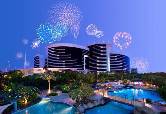 The unique 5-star hotel offers world-class family service. New Year’s shows here are held with a real oriental flavor and scope. Each guest is greeted royally. For accommodation are provided Family Deluxes, Regular and Presidential Suites, luxury villas with one bedroom and private pool. The main building has 598 rooms with panoramic glazing. By the sea itself, 19 houses have been built. A gala dinner is held in 4 banquet halls, DJs and performances of artists are also “charged” in the nightclub. The celebration ends with a grand fireworks display over burj Al Arab. This traditional fireworks venue in Dubai is 500 metres away. In the morning, all 22 restaurants are opened to organize meals for vacationers. Also at guests’ disposal: an outdoor swimming pool with temperature conditions, a SPA center in a separate building (sauna, hammam, jacuzzi for free, procedures are paid), a children’s club, sports grounds, beach entertainment. Wild Wadi Water Park is 100 metres away.