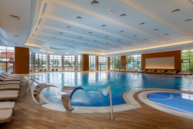 On the territory of the hotel there are several swimming pools (indoor, outdoor and children’s), for guests the territory is equipped with free sun loungers and umbrellas. Massages are available for a small fee.