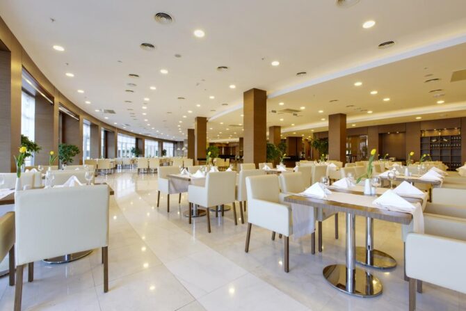 The hotel complex owns two excellent restaurants, a coffee shop and a small pool bar. Guests can appreciate the “Ultra All Inclusive” system, which has long gained popularity among Russian travelers.