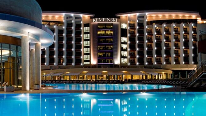 Кемпински Гранд Отель Геленджик | 5 км до аэропорта Геленджик | Стандартный Делюкс Люкс Люкс-бунгало Президентский люкс | Мини-бар Сейф Телевизор Телефон Кондиционер Фен Радио Утюг | Бассейн СПА Фитнес Джакузи Солярий Детская игровая зона | Дети до 6 лет – бесплатно. Минимальная цена за номер за одну ночь – 190 EUR. | Нет. |