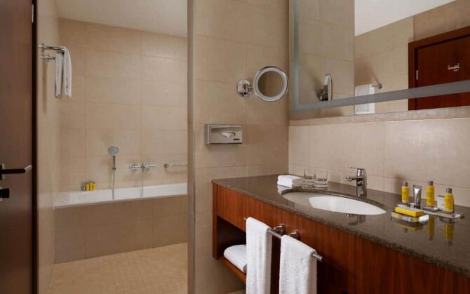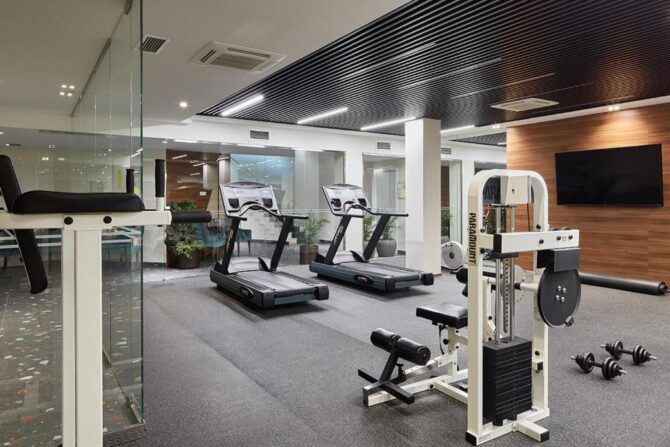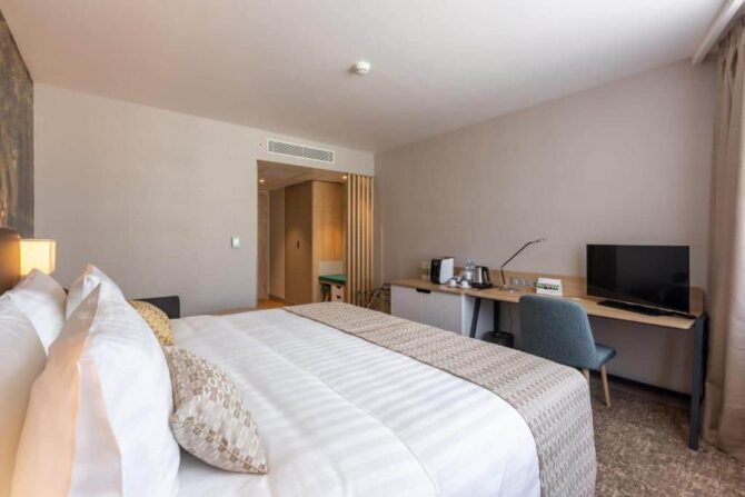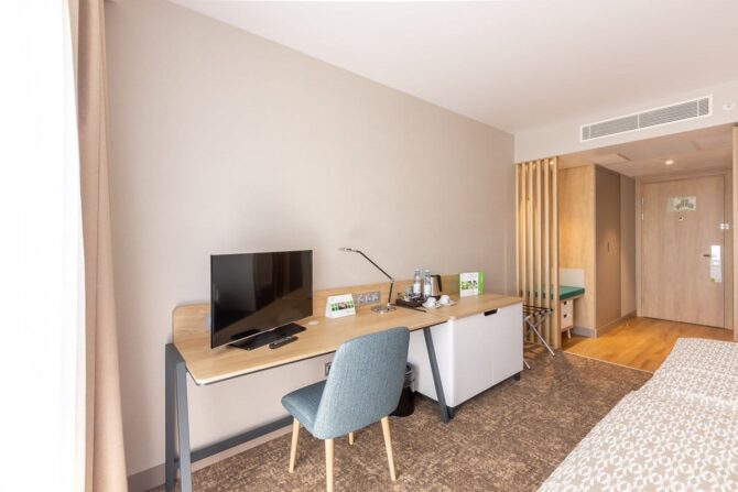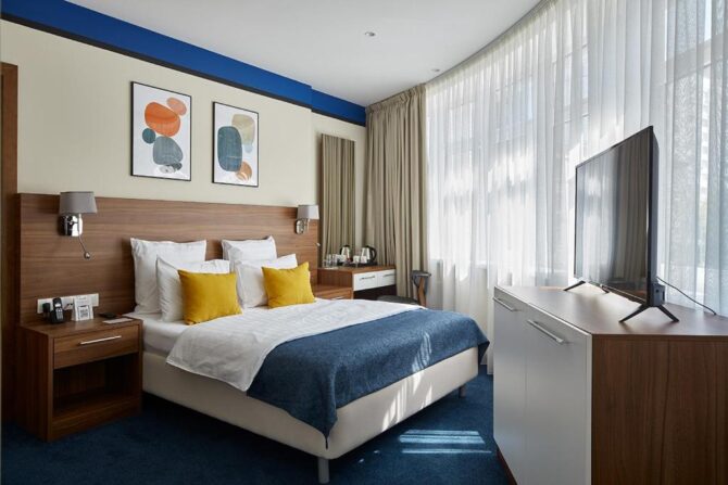 All hotel rooms are decorated in warm colors, they are spacious enough and equipped with everything you need. The rate includes access to the fitness centre and sauna, which is the perfect end to a busy day.