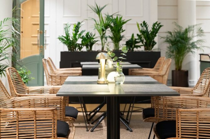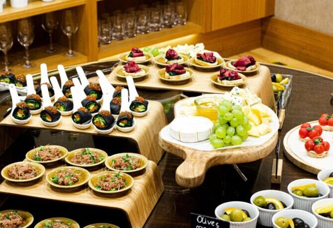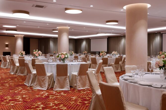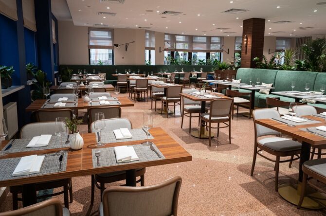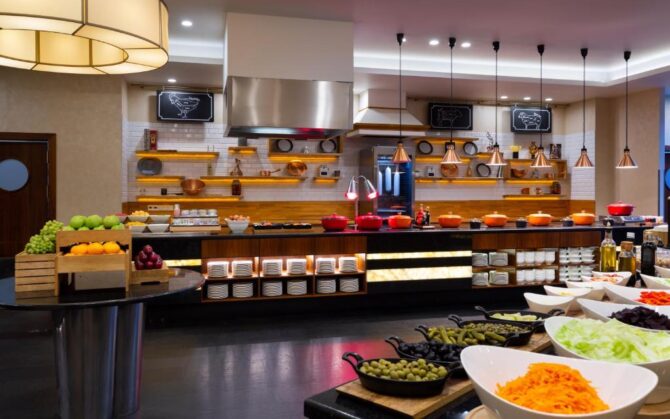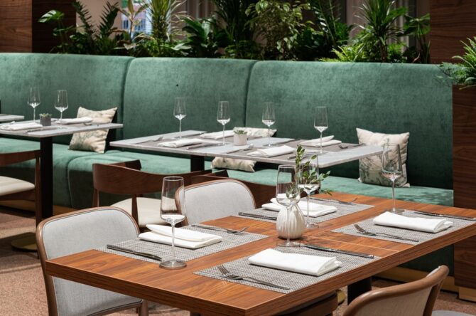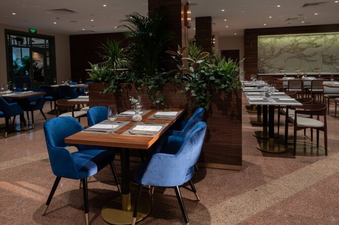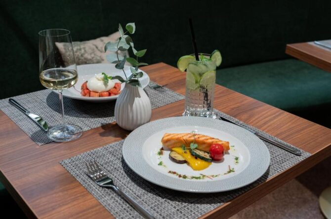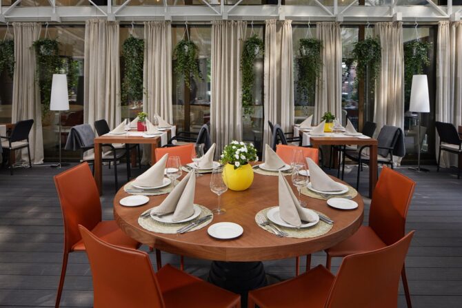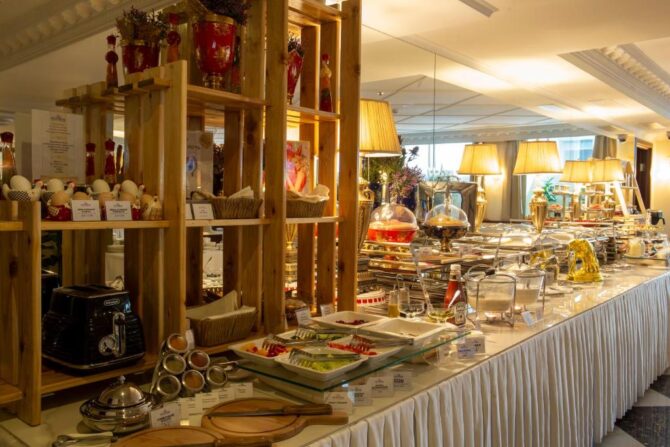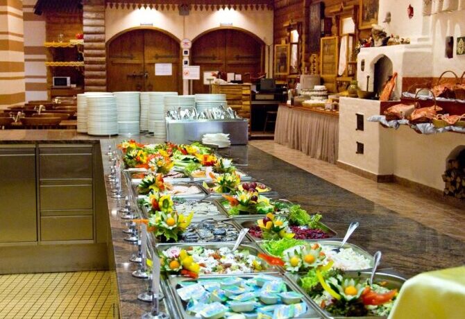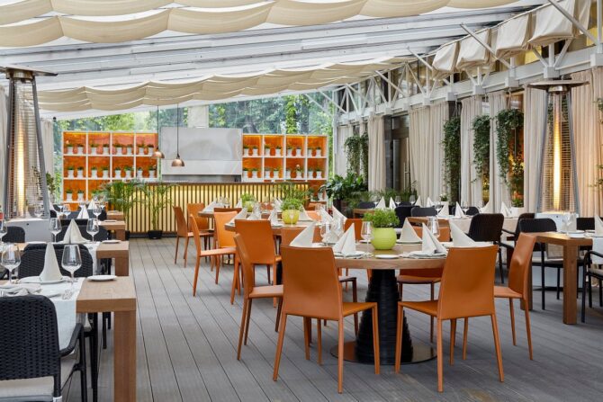 The hotel restaurant of international cuisine includes several halls. One of them serves delicious breakfast buffets every morning. The restaurant is perfect for a variety of events.