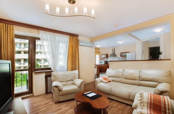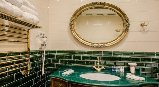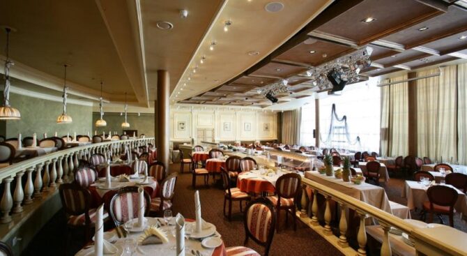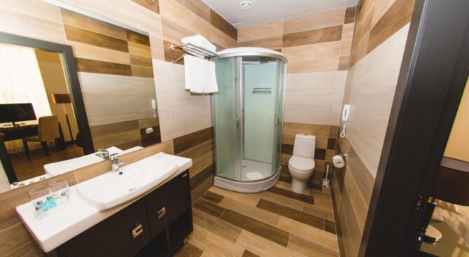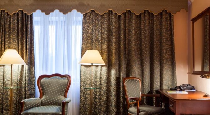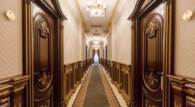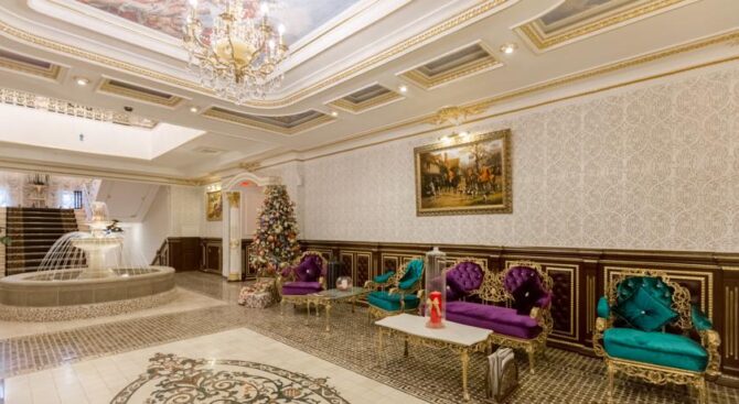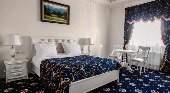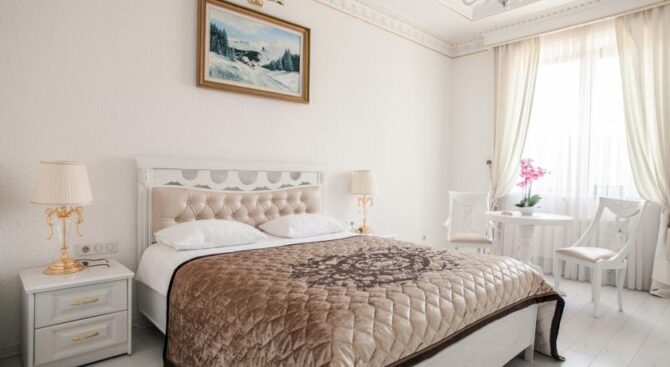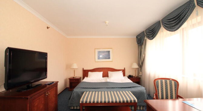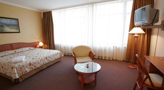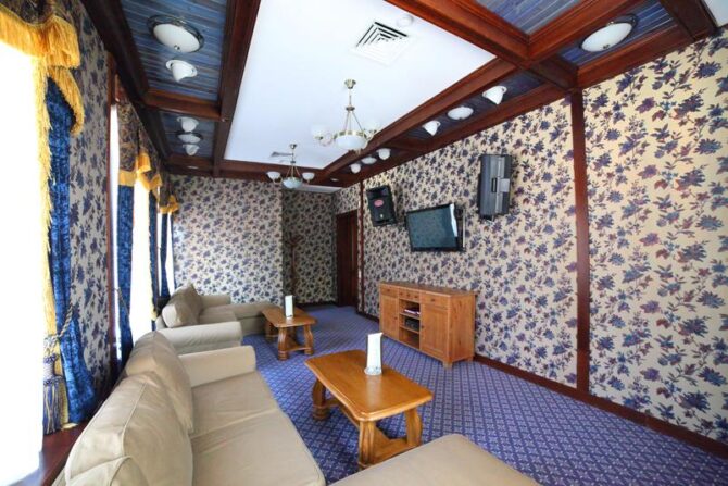 Guests with exquisite taste will enjoy the paintings and unique crystal chandeliers in the rooms. Rooms are small, up to 25 sq.m. There is a “presidential suite”, a room for newlyweds. The rooms have a full set of necessary household appliances. Rooms are also equipped with safes.