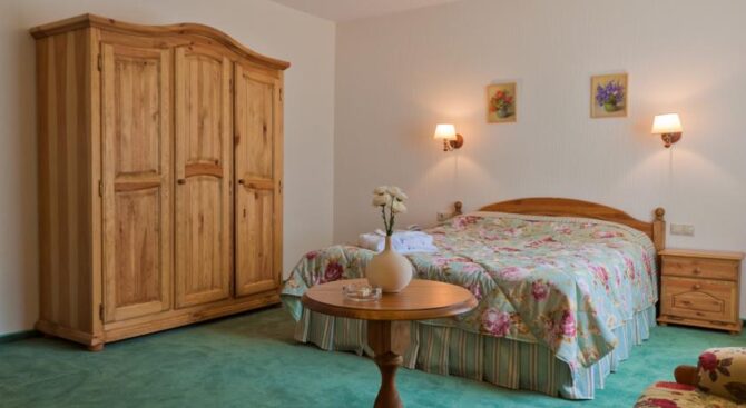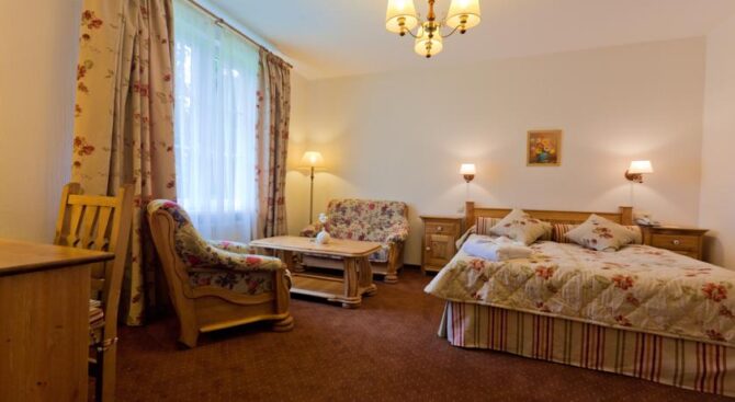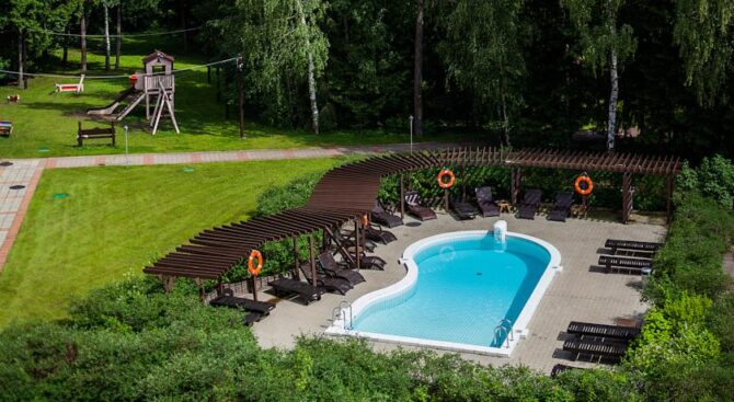 The building and interiors are made in the style of an eighteenth-century palace. All rooms are very large with individual air conditioning and internet access. Placing the hotel in a pine forest creates opportunities for excellent recreation for active guests: bike paths, gym, hiking trails at their service.