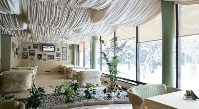 The hotel complex includes almost 130 rooms and more than 50 cottages. Rooms of different price class, in the highest group “presidential rooms” (with jacuzzi and sauna) and rooms “Suite”. The rooms are decorated with classic pastel colours. Rooms of the middle price segment are small 16-22 sq. m, with underfloor heating, shower, bath.