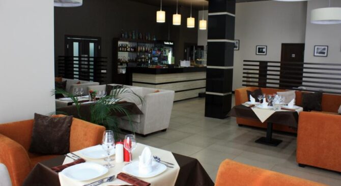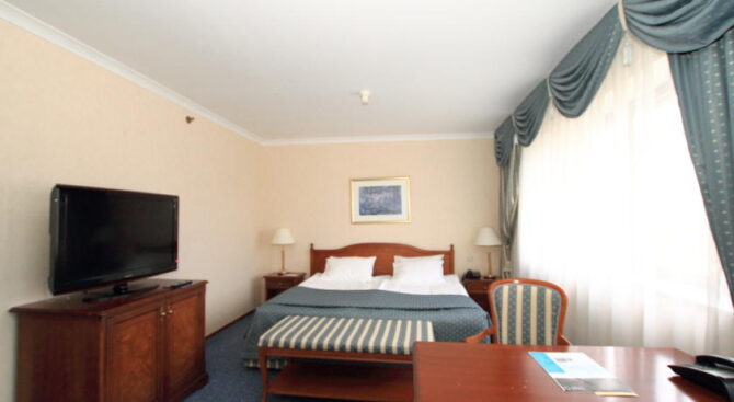 All rooms are equipped with necessary appliances, luxury rooms have guest areas. The service of a standard four-star hotel is a round-the-clock reception, additional services of service. For guests to relax there is a SPA area., swimming pool, a large adjacent area. There is a billiard room, a bowling alley.