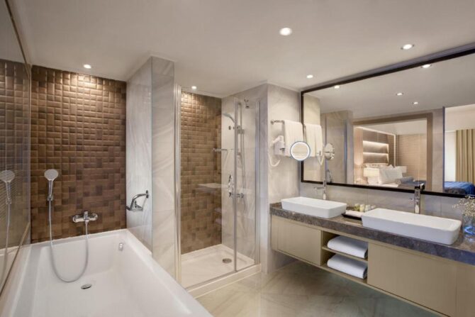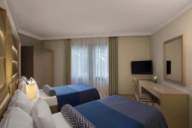 The winter concept of the fashionable Mirage Park Resort includes the “Ultra All Inclusive” service format. The main night of the year includes a New Year’s program with the participation of a dance show, a performance of circus artists (magician, jugglers), live vocals, instrumental accompaniment, belly dance, a disco until the morning. Children will become participants in the presentation of soap bubbles and balloons. For movie lovers, a marathon of favorite movies is arranged. The feature of the restaurant service is the preparation of gluten-free dishes. They are exhibited on the swedish line system in the public domain. This is the first and so far the only buffet in Turkey with such food. For guests there are SPA and Wellness centers, a water park, a game room, a children’s club, a team of animators. A water sports centre is organised on the beach. Such hotels try to provide services for guests of all age categories.