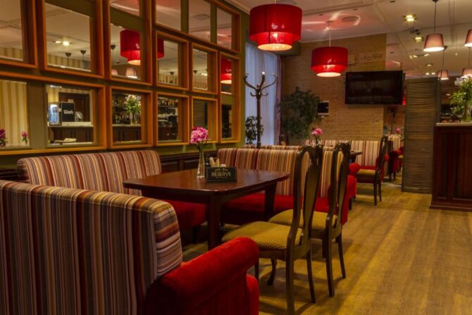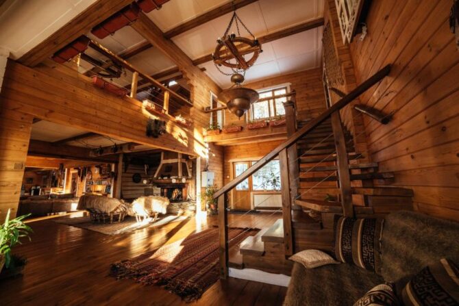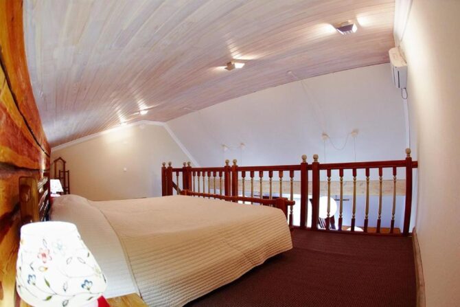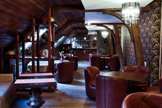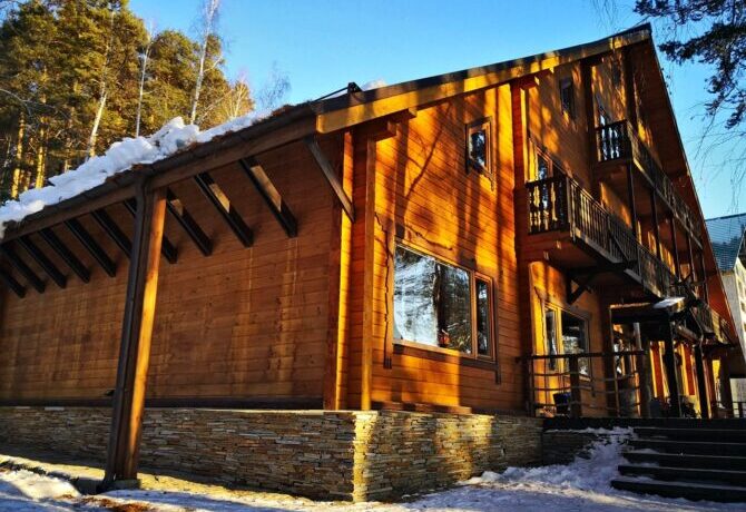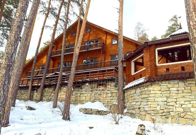 On the shore of Lake Turgoyak comfortably located numerous small hotels. One of them is a guest house-chalet built in alpine style and is designed for 5 rooms. On the ground floor there is a large living room with fireplace and bar, communal kitchen. Bedrooms are located on the 2nd and 3rd floors. The rooms are decorated in the same style, but differ in names. Here you can live in the chambers of Baron Mueunghausen, Robinson Crusoe, Indiana Jones, Crocodile Dundee, Captain Jack Sparrow. There is no charge for pets, but you must be warned in advance about your arrival with your pet. Winter rest is provided – cross-country and downhill skiing (to the ski complex 30 minutes drive), snowmobile races, skating rink, tubing, Russian sauna on firewood. The barbecue area is available on the covered terrace. Within walking distance there are several restaurants where you can order a New Year’s banquet.